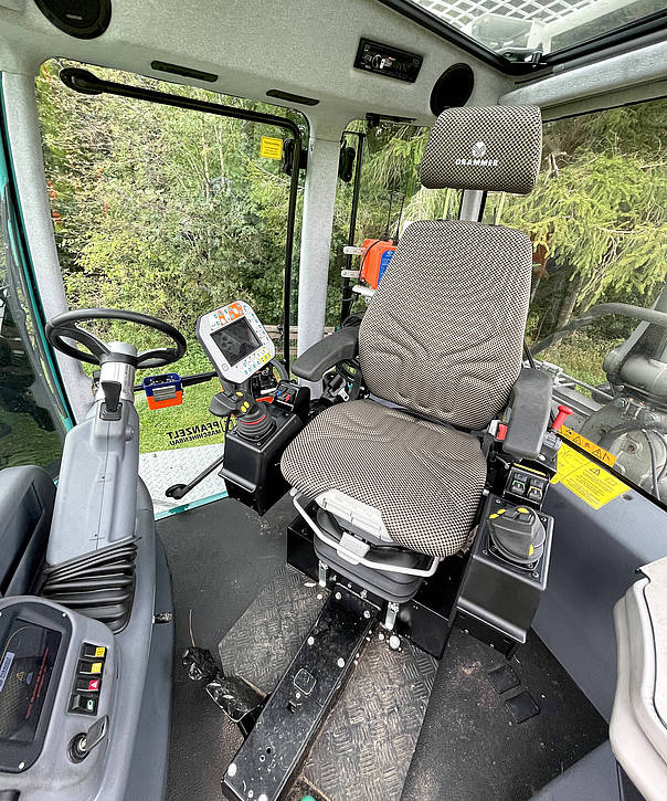The pneumatically suspended, large-volume cab which was developed by Pfanzelt enables quiet and comfortable working with perfect all-round visibility. A new noise insulation concept allows quiet and vibration-damped operation during use, especially at high engine speeds.
