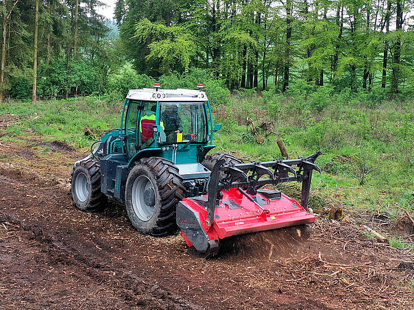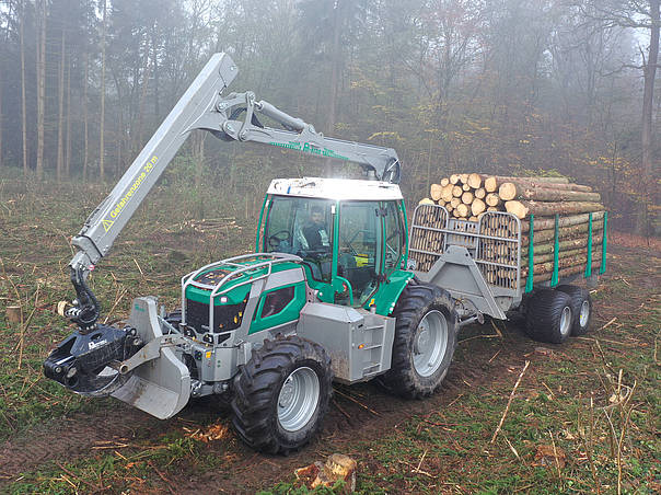 As soon as the forestry implements have been removed, the tractor can be used for agricultural purposes without any additional conversion measures, as neither the rear power lift nor any other relevant components are modified for forestry operation. In addition to the rear and front attachment areas, front loader consoles are also part of the multiurpose tractor’s concept.