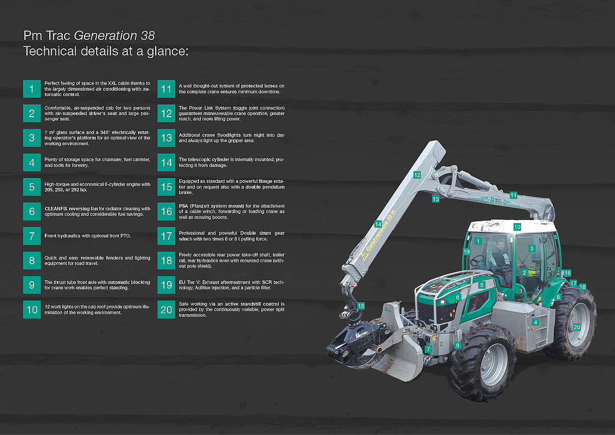 From the outside, the Pm Trac hardly looks any different. However, much has been further developed on the chassis, and new components are used. The chassis is built over a frame in which the individual units are installed. The biggest change to the chassis concerns the transaxle. The transmission and rear axle unit was previously purchased from ZF. With the new series, Pfanzelt produce the unit themselves – the variaDRIVE transmission as well as a new, planetary-driven rear axle from Pfanzelt are used. The Pm Trac Generation 38 is now based on an almost 100% Pfanzelt tractor chassis. This enables the complete adaptation of all components to heavy-duty use in forestry and as a multipurpose tractor. The days of using components from agricultural tractors are over. The Pm Trac plays in a new league.