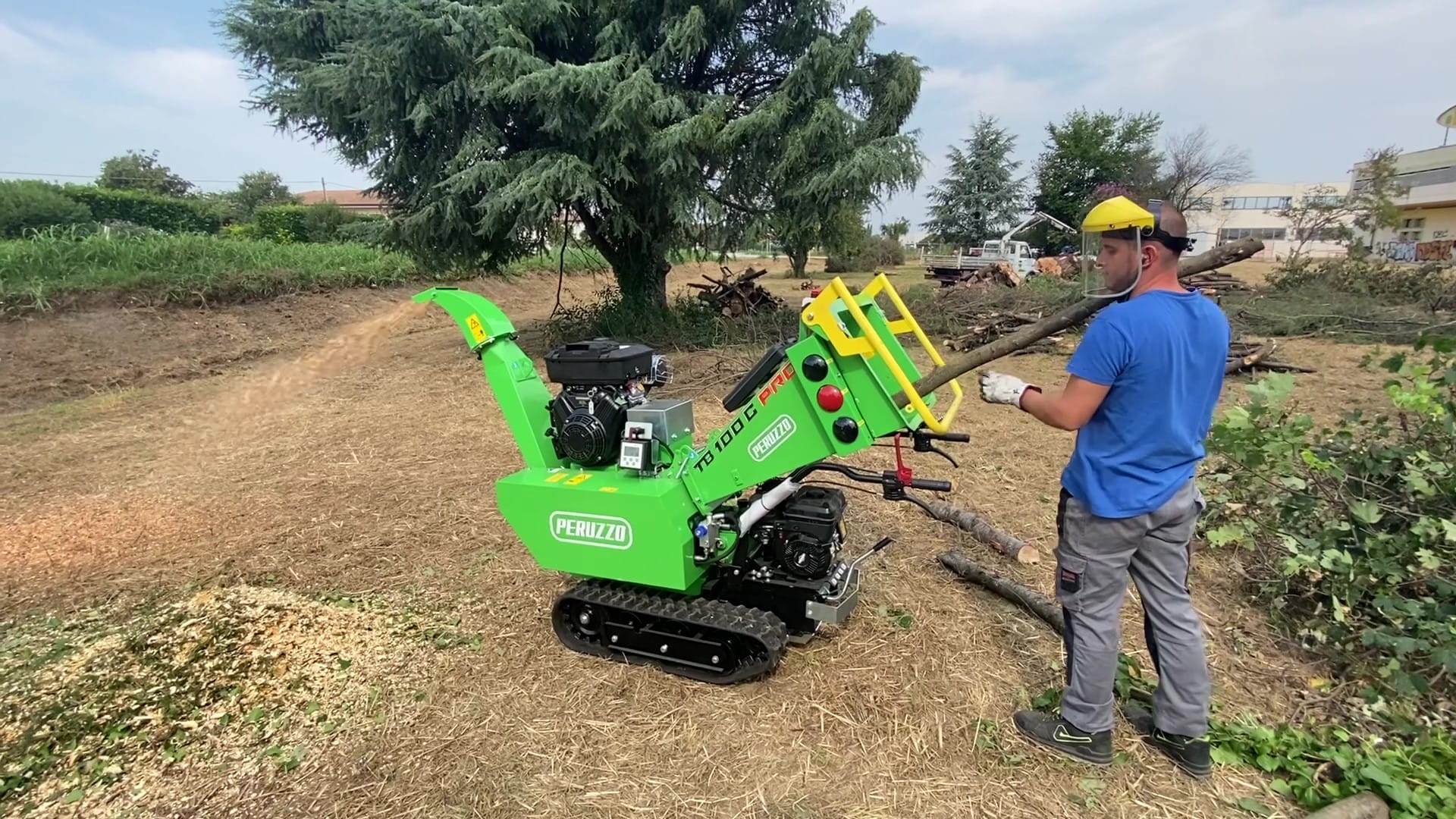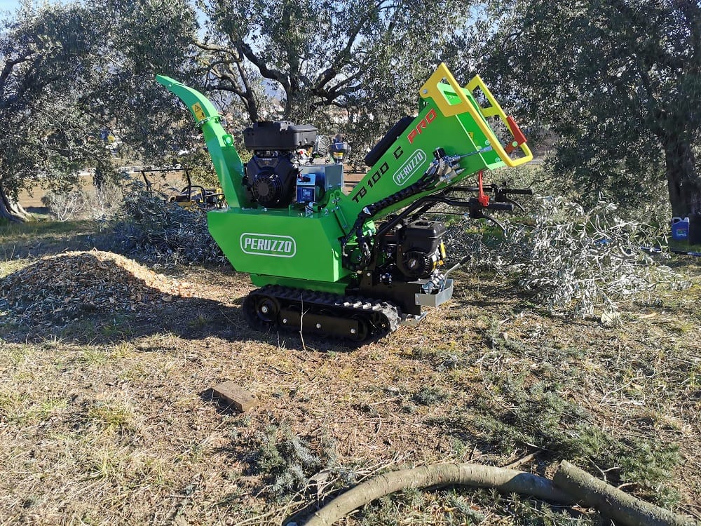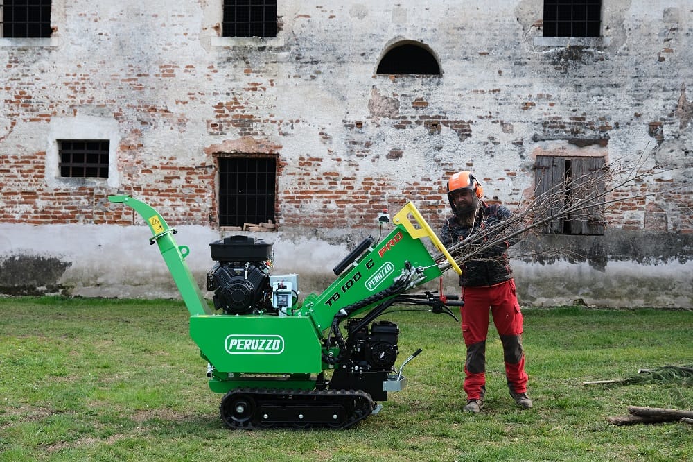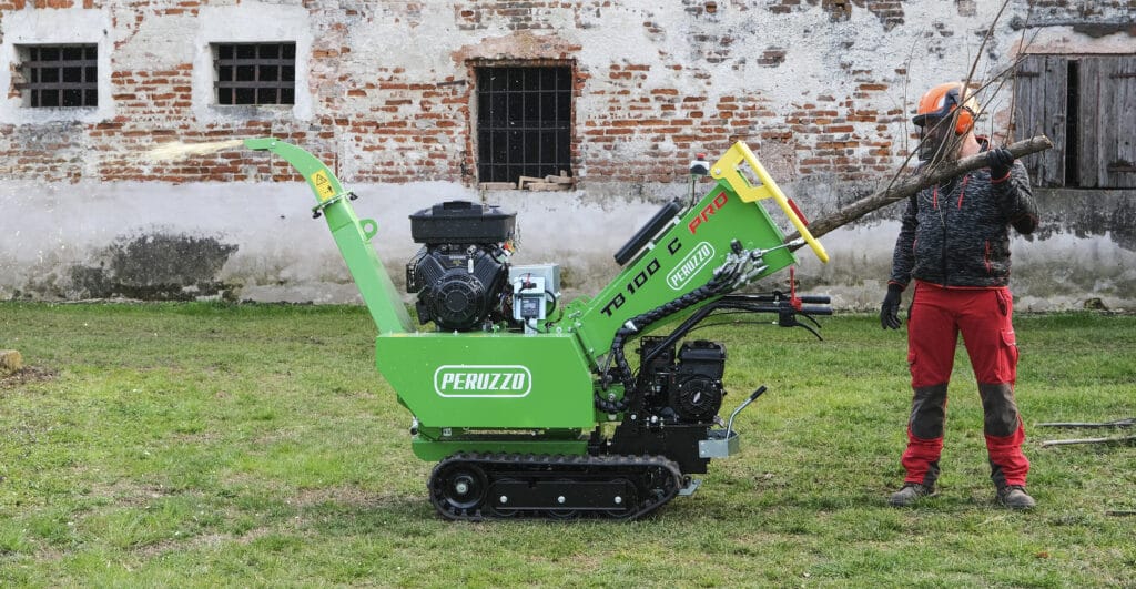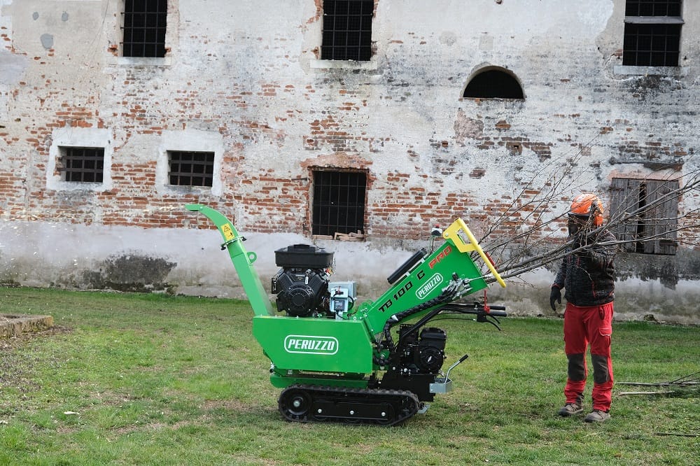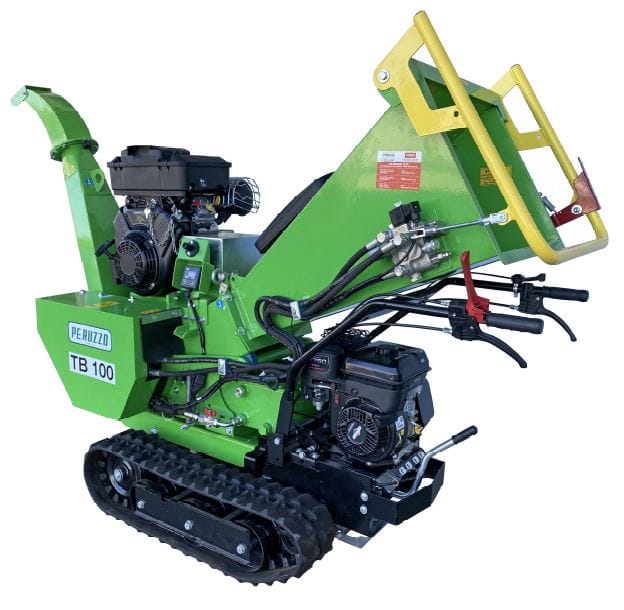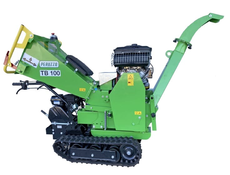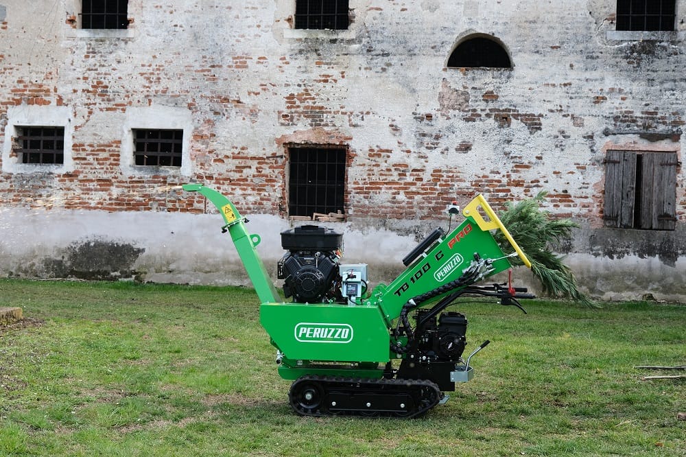 La déchiqueteuse à tambour TB100-C PRO est équipée d’un rotor à 2 pales et d’un rouleau d’entraînement hydraulique, réglable en vitesse, avec des dents à haute adhérence, un système sans stress en standard et grâce à la grande trémie inclinée, la machine traite les branches, les brindilles et les boutures avec une grande facilité. La force centrifuge créée par le rotor expulse le matériau finement broyé, le projetant hors de la décharge (pivotant et réglable en hauteur) à une distance d’environ 3/7 mètres (selon le produit), et permettant un chargement facile en présence de conteneurs spéciaux ou sur remorques. Les dimensions hors tout moyennes et les chenilles (entraînées par un moteur indépendant de 5 CV) lui permettent d’être utilisé même dans des zones étroites ou des terrasses, ainsi que de charger facilement sur des camionnettes basculantes, grâce à l’aide de rampes spéciales. Produite dans les usines Peruzzo, cette déchiqueteuse est propulsée par un moteur à combustion interne de 23 CV et peut devenir, en quelques étapes simples, une brouette agile (accessoire séparé) utile pour le transport de bois et d’autres matériaux.