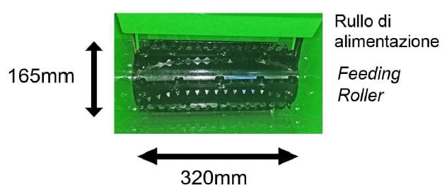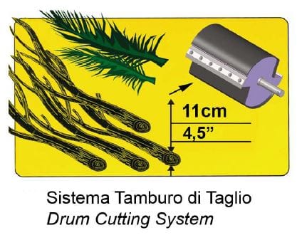 Tambour de coupe (240 mm de diamètre et 310 mm de largeur) avec 2 lames à haute résistance à double tranchant, auxquelles est ensuite ajoutée une contre-lame également en acier trempé