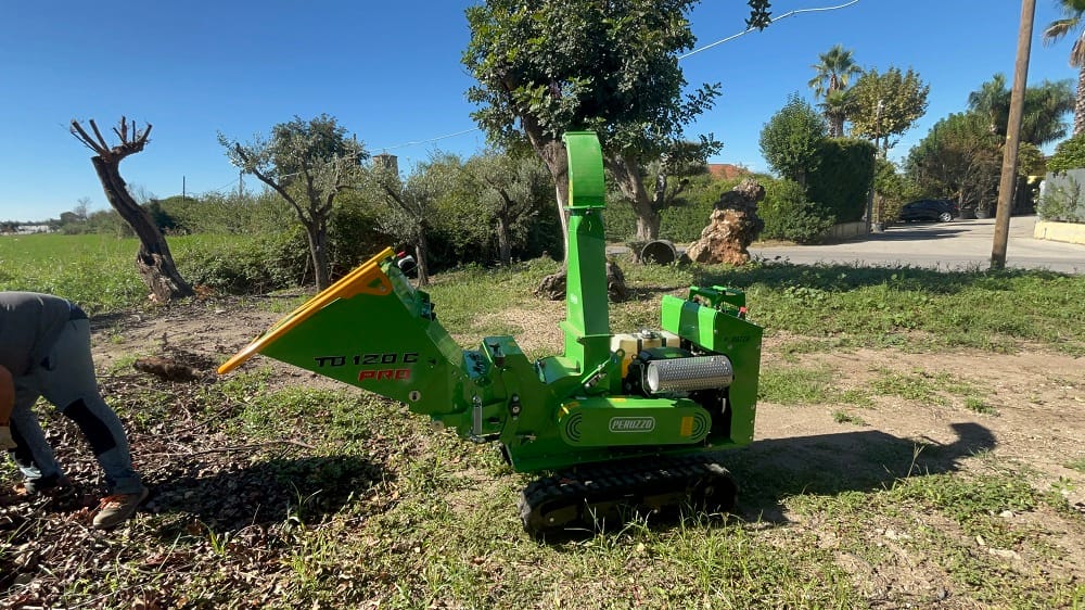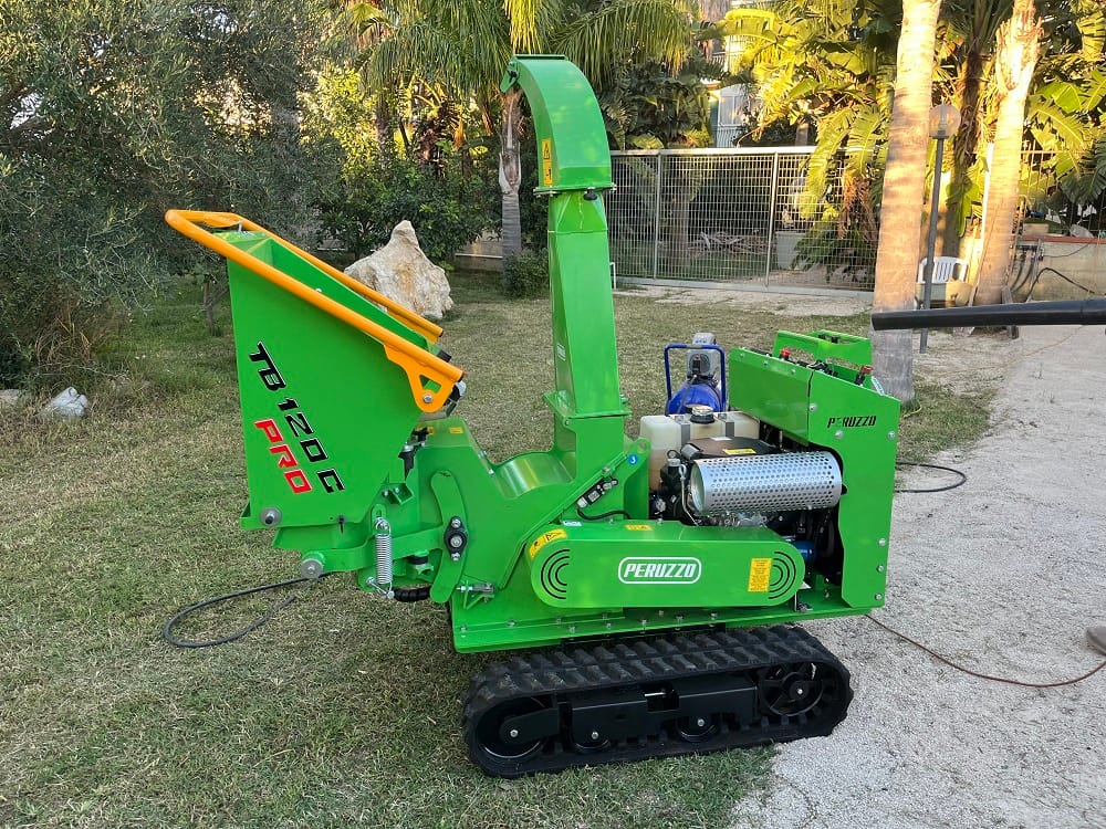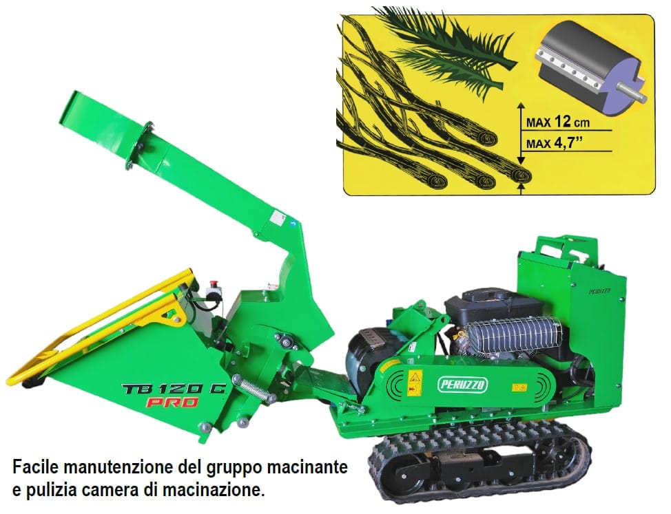 La déchiqueteuse à tambour TB120-C PRO est une machine capable de broyer et d’expulser facilement tout type de résidu végétal, même particulièrement fibreux (palmiers), humide et très feuillu (même juste des feuilles). De plus, cette déchiqueteuse a la particularité innovante d’être équipée d’une ouverture facile de l’unité de couteaux, pour faciliter un entretien rapide de l’unité de coupe. La machine est également équipée de chenilles larges et robustes, entraînées par deux moteurs hydrauliques : cela lui permet de s’attaquer facilement à toute aspérité du sol et/ou au chargement et au déchargement. La présence d’un panneau de commande pour l’avancement de la machine ainsi que de boutons ergonomiques qui permettent un contrôle total du fonctionnement du rouleau d’entraînement pendant les phases de travail est innovante.