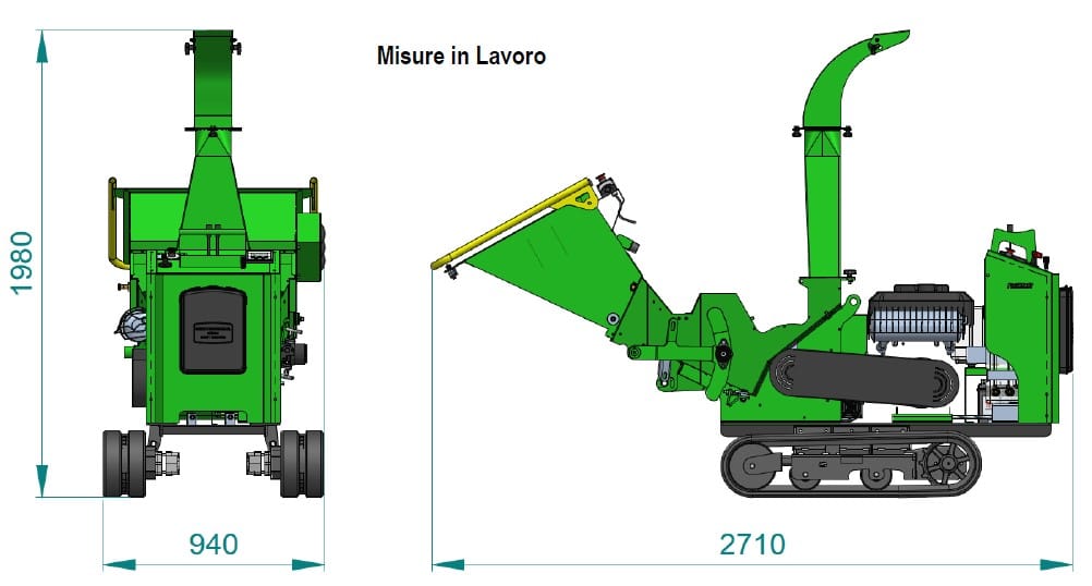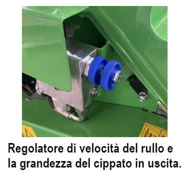 La force centrifuge créée par l’unité de coupe à tambour ouvert expulse le matériau broyé de manière fine (de 1 à 3 cm), en le projetant hors de la décharge (pivotante et réglable en hauteur) à une distance d’environ 3/7 m (selon le produit) et à une hauteur de 200 cm