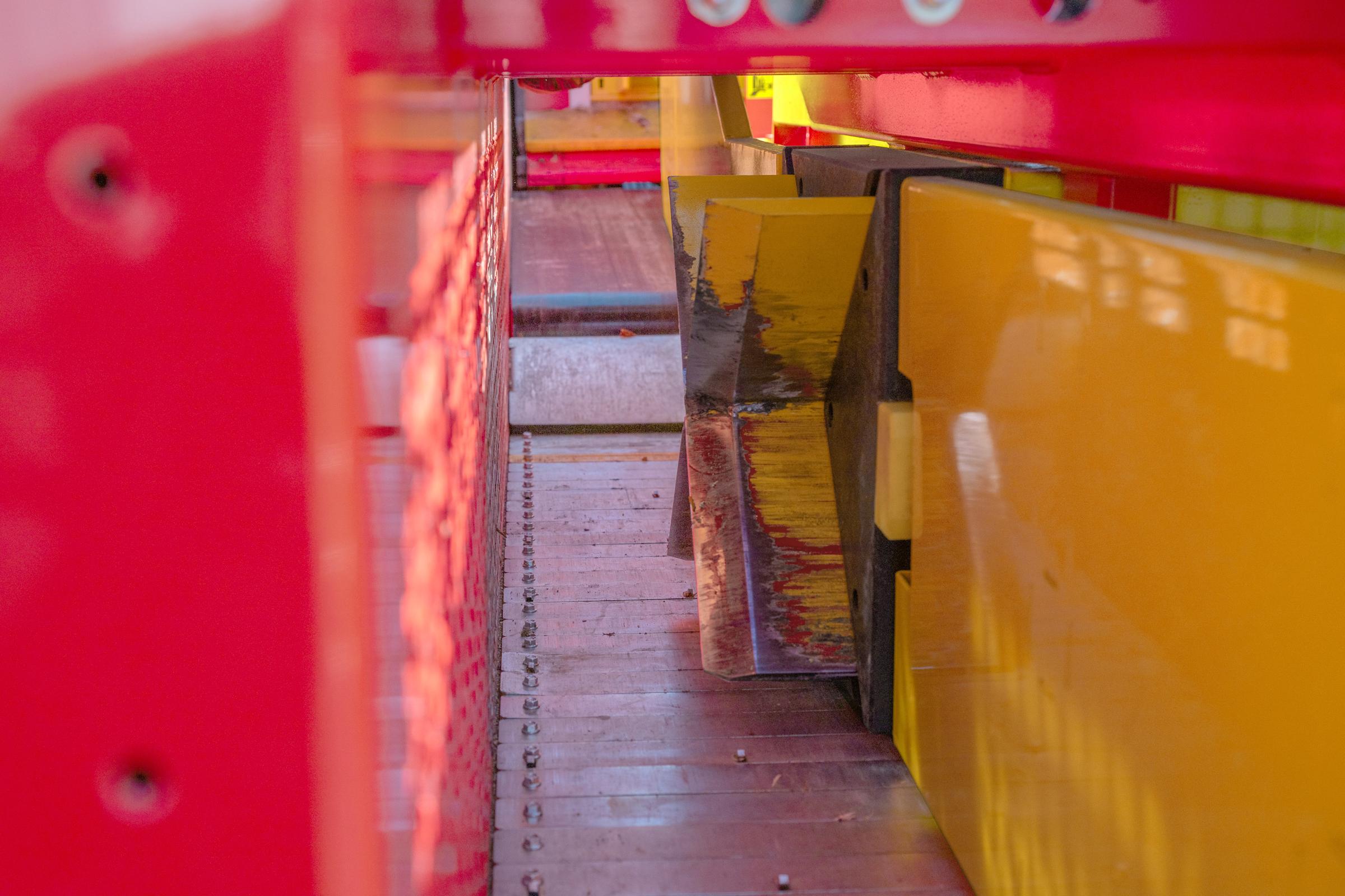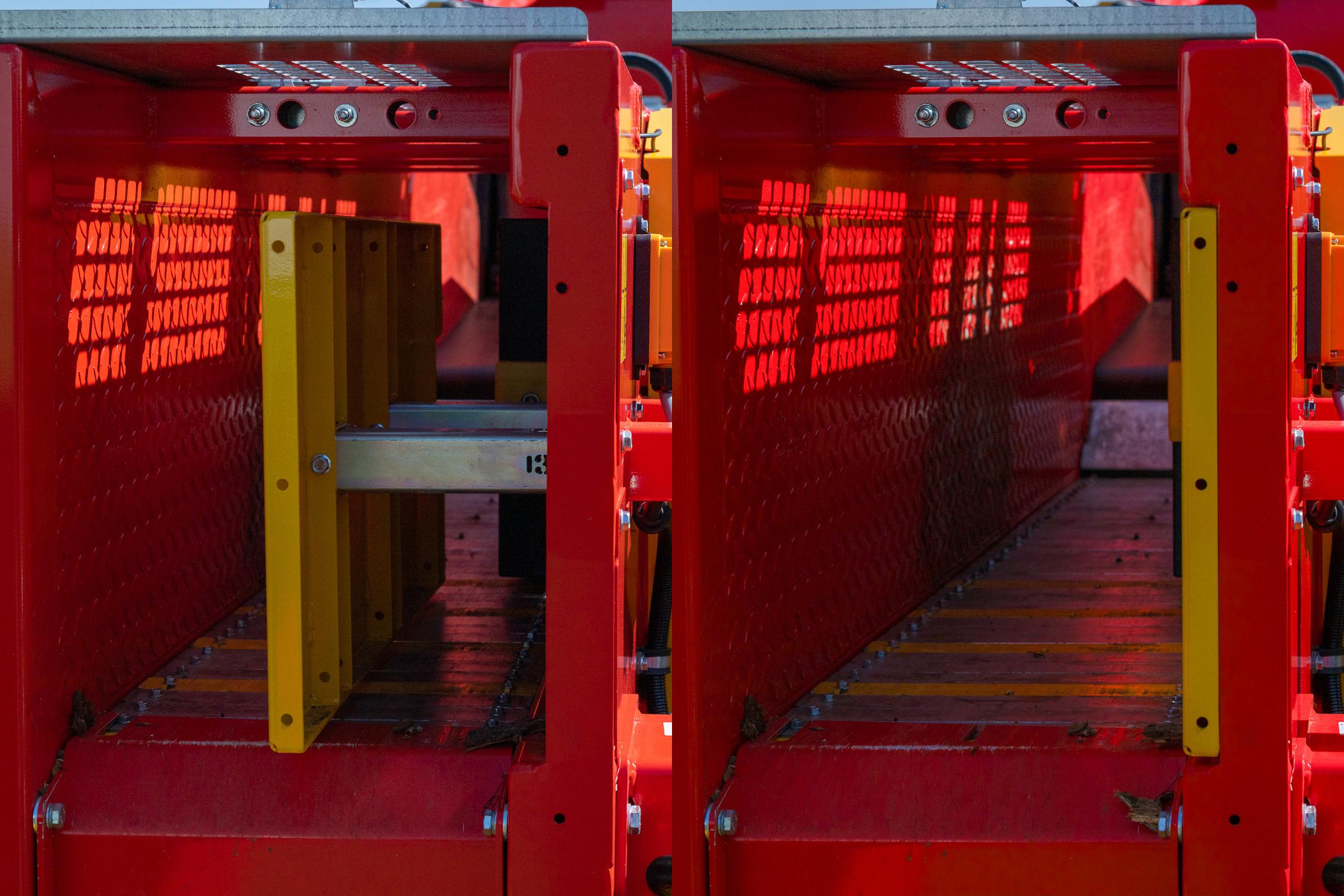 • Canal de fendage avec un tapis métallique dont le pas d’avancement est réglable pour définir la section des bûches à produire.