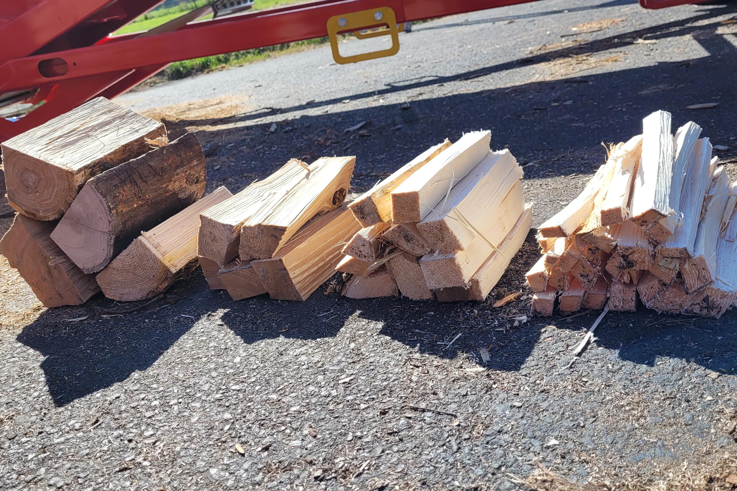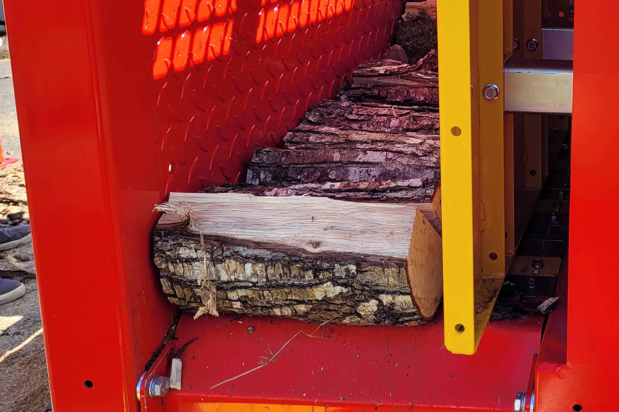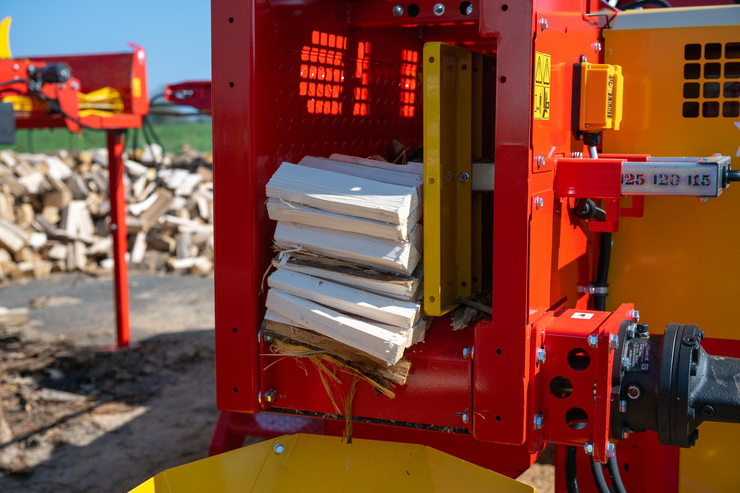 Les bûches sont ensuite fendues par des couteaux en croix avec une puissance de 16 tonnes, sur un tapis métallique à pas réglable permettant d’ajuster précisément la section finale (30 à 150 mm). Il est également possible de produire du bois d’allumage.
