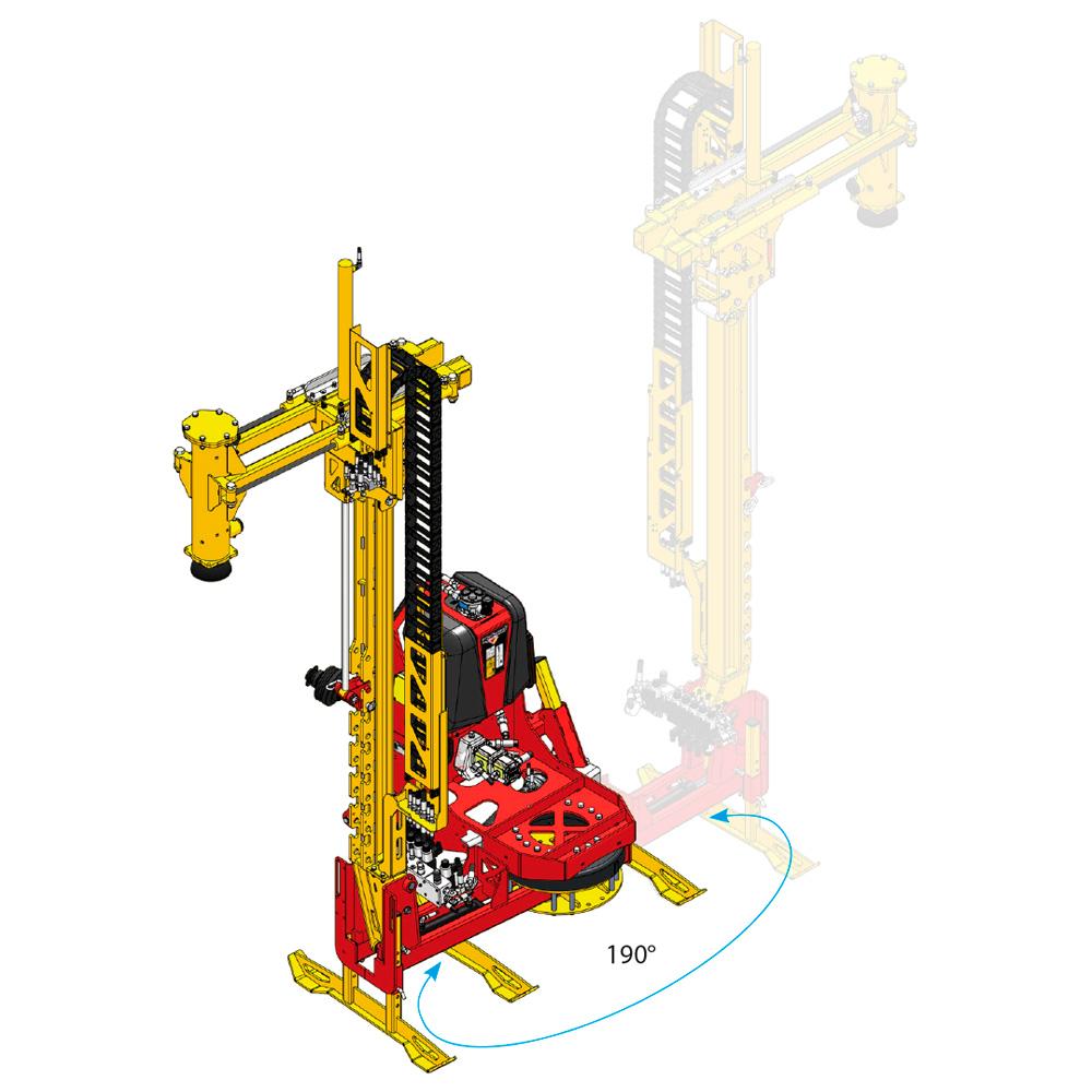 Pour faciliter le travail en terrains difficiles, le système de rotation à 190° avec sa couronne à billes réduit les risques d’accrochage et simplifiant l’entretien. Un moteur hydraulique de 125 cm³ offre un couple quatre fois supérieur au modèle précédent, garantissant une rotation fluide même en forts dévers. De plus, un dispositif anti-retour évite tout basculement ou mouvement incontrôlé en pente.