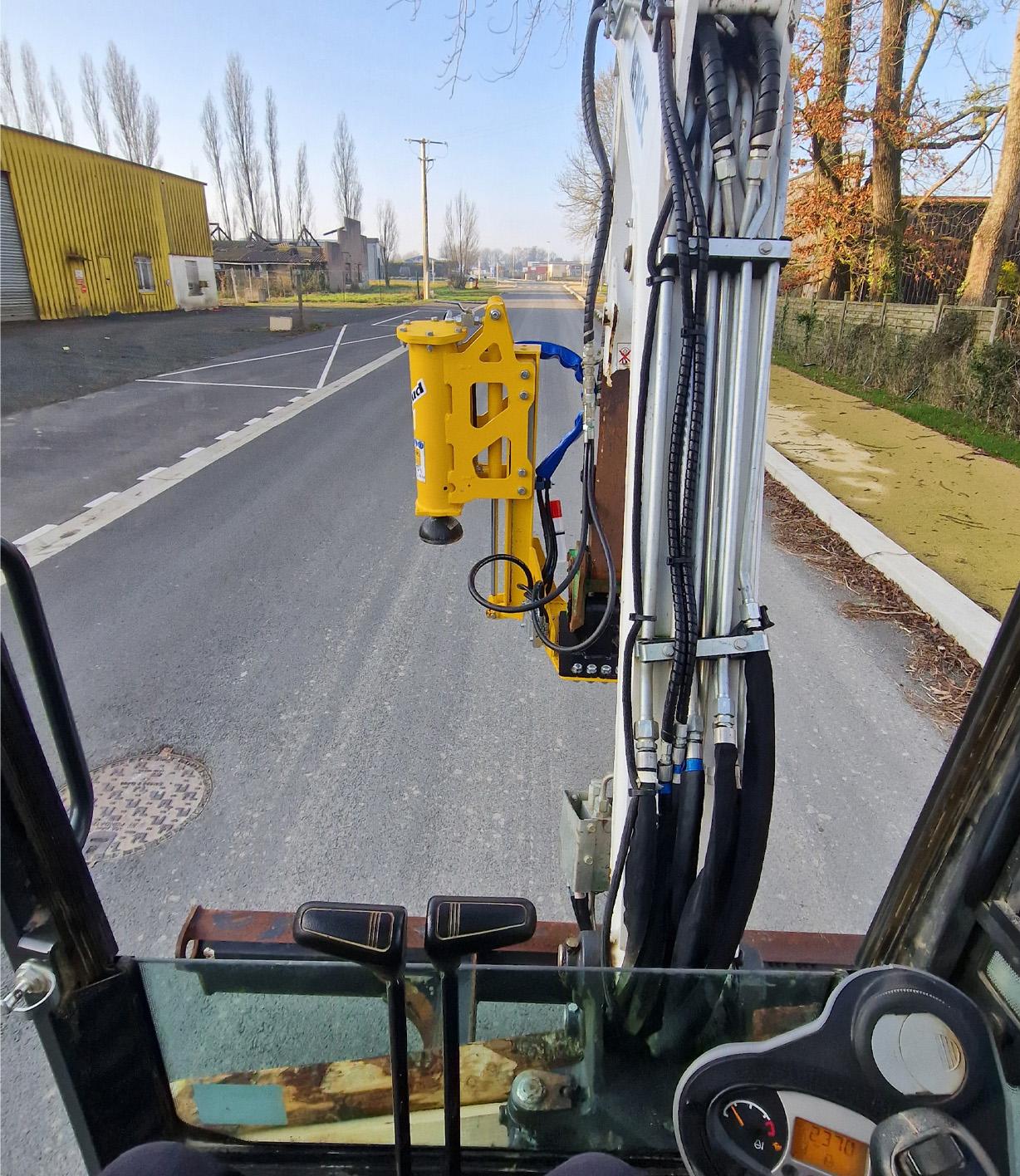 En option il est possible d’ajouter une inclinaison hydraulique de +/- 20°. Cet enfonce-pieux sur mini-pelle a été conçu pour enfoncer des piquets bois ou métal (avec option martyr).