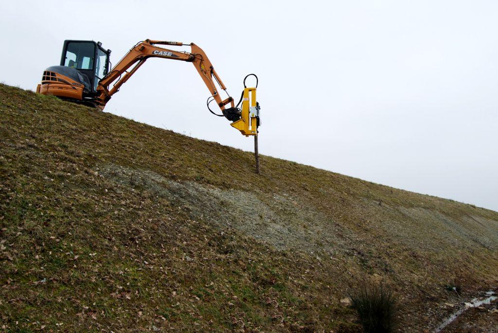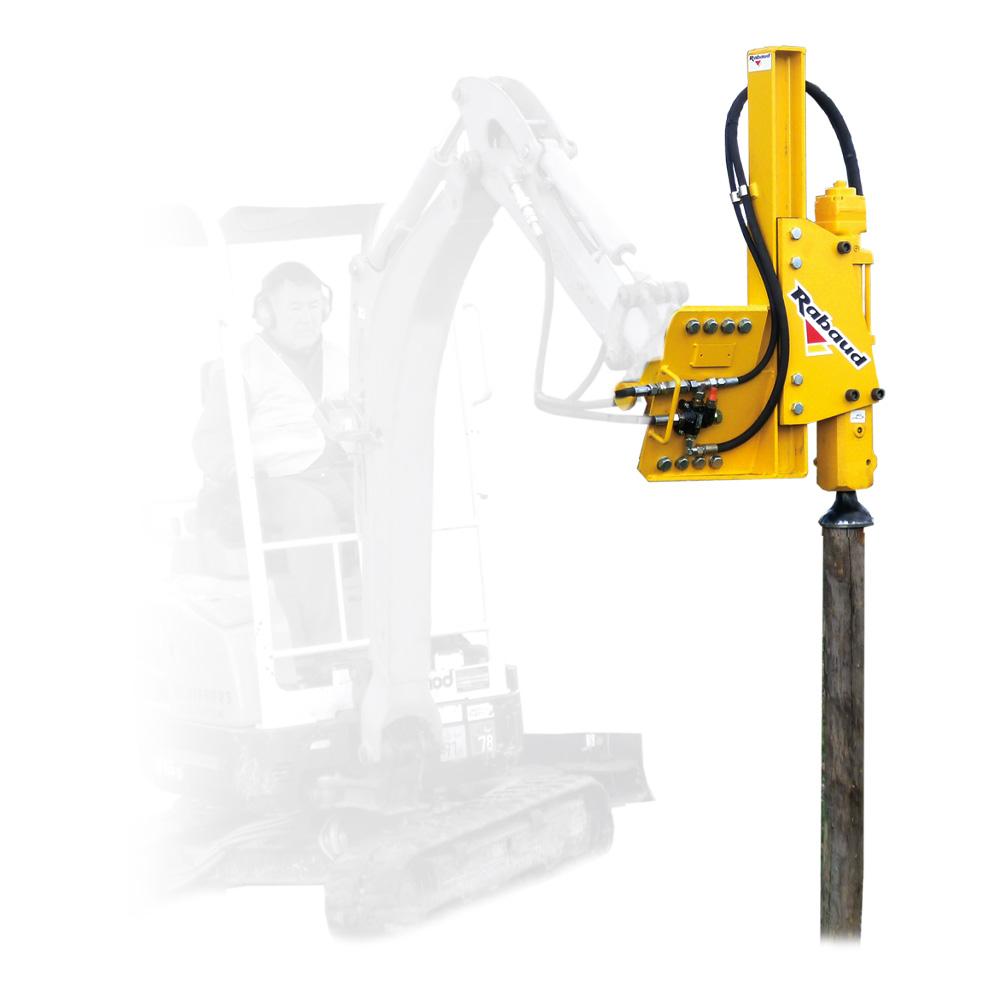 Enfonce-pieux par percussions adaptable sur mini-pelle, tracto-pelle, télescopique, chargeur… L’adaption est faite sur mesure selon le modèle de votre porteur et son attache.
