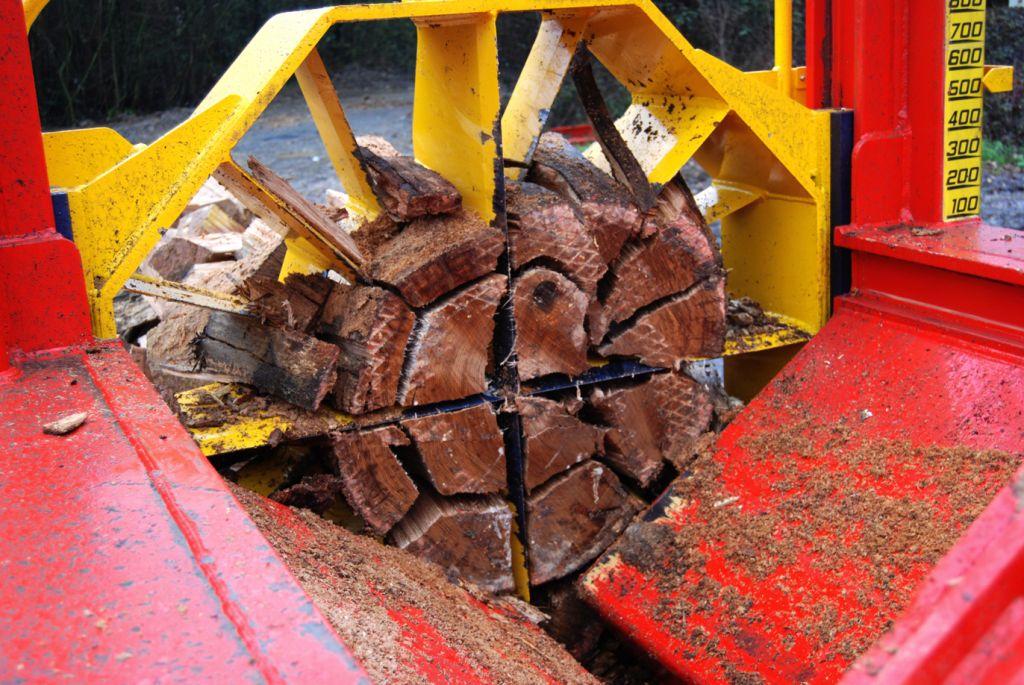 Un poussoir exerce une force de 80 tonnes pour pousser les bûches vers la grille. Cette grille de fendage est interchangeable, offrant trois modèles pour diviser les bûches en 16, 24 ou 28 éclats. De plus, la hauteur de la grille est ajustable hydrauliquement, ce qui permet de l’adapter au diamètre du bois en la plaçant au centre de la grume.