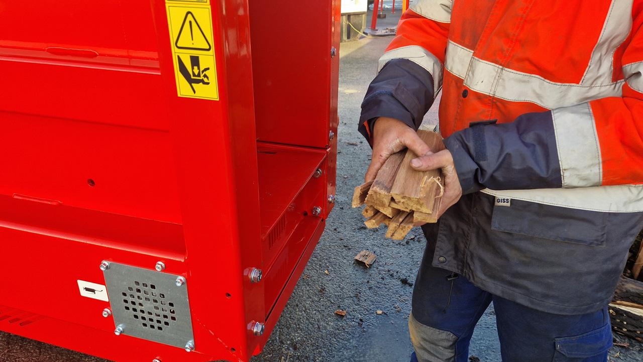 Cette machine est facile d’entretien et d’utilisation : une fois la goulotte d’entrée approvisionnée, le bois est dirigé par le biais d’un tapis métallique vers une croix de fendage. Une fois fendues, les briquettes sont conduites vers un système d’ensachage par filet, permettant de contrôler plus facilement la quantité et rendant les bûchettes plus faciles à transporter.