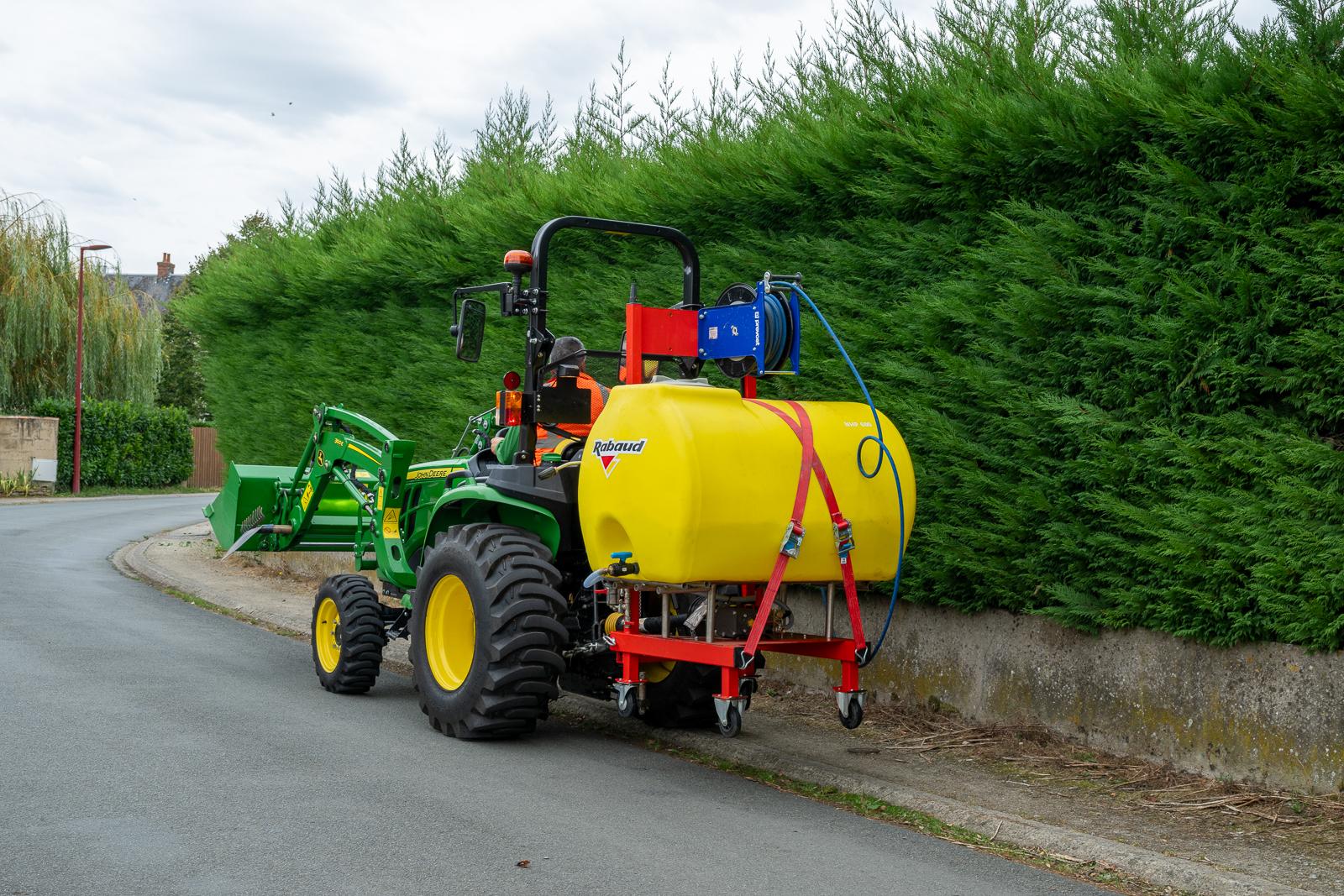 Adaptable sur les trois points d’un tracteur et entraîné par la prise de force, cet auto-laveur ne requiert aucun moteur thermique ni branchement électrique.