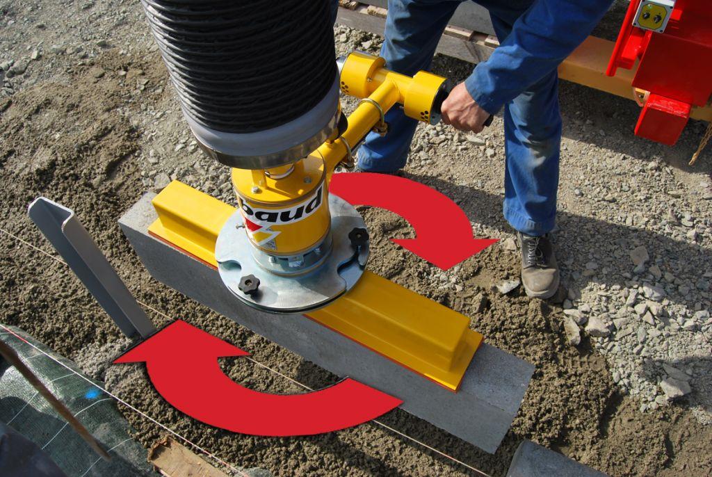Grâce à son mât inclinable pour une mise à l’aplomb parfaite et à la rotation de la ventouse à 360°, l’opérateur peut poser sa bordure avec précision le long d’un cordeau ou dans les endroits exigus.