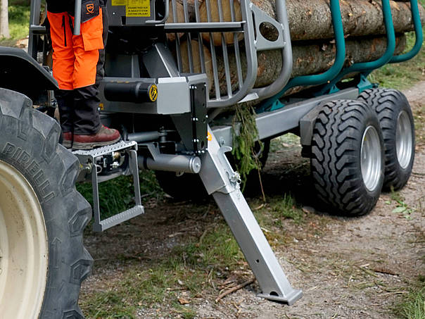 Les remorques forestières S-line sont équipées de série d’un timon articulé à large rayon de braquage. Deux solides vérins hydrauliques pouvant être actionnés sur le tracteur pendant le trajet, assurent une manipulation fiable même si la remorque forestière est chargée et qu’il faut effectuer une rotation en pente. Pour les trajets sur route, le timon articulé peut être bloqué mécaniquement.