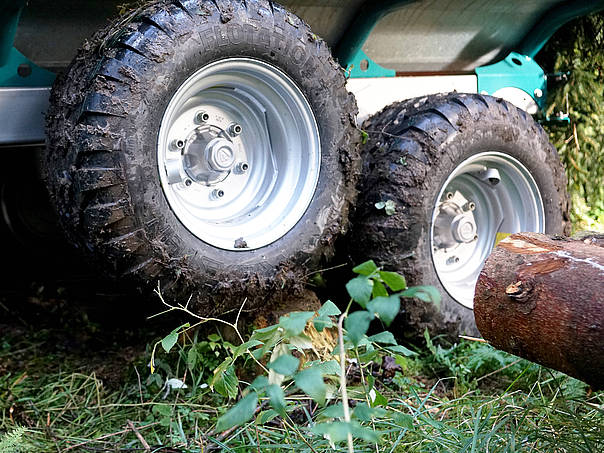 L’essieu bogie assure une stabilité lors des travaux de grutage, mais aussi sur les trajets tout terrain, notamment dans les layons de débardage en pente. La répartition homogène de la pression au sol représente un autre avantage.