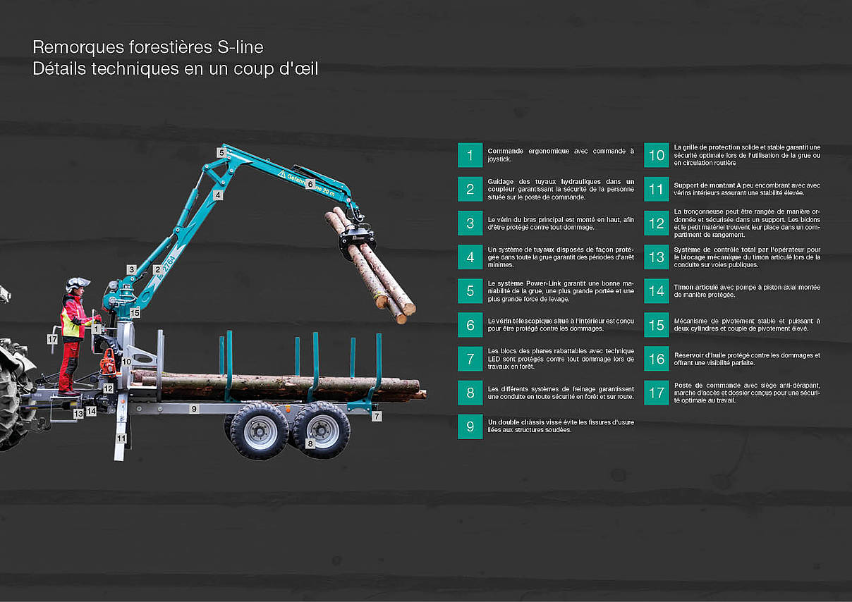 Les remorques forestières S-line se distinguent notamment par leurs dimensions compactes, leur permettant d‘être combinées avec un petit tracteur et ainsi d‘offrir une très bonne manoeuvrabilité dans des peuplements denses ainsi que des performances élevées.