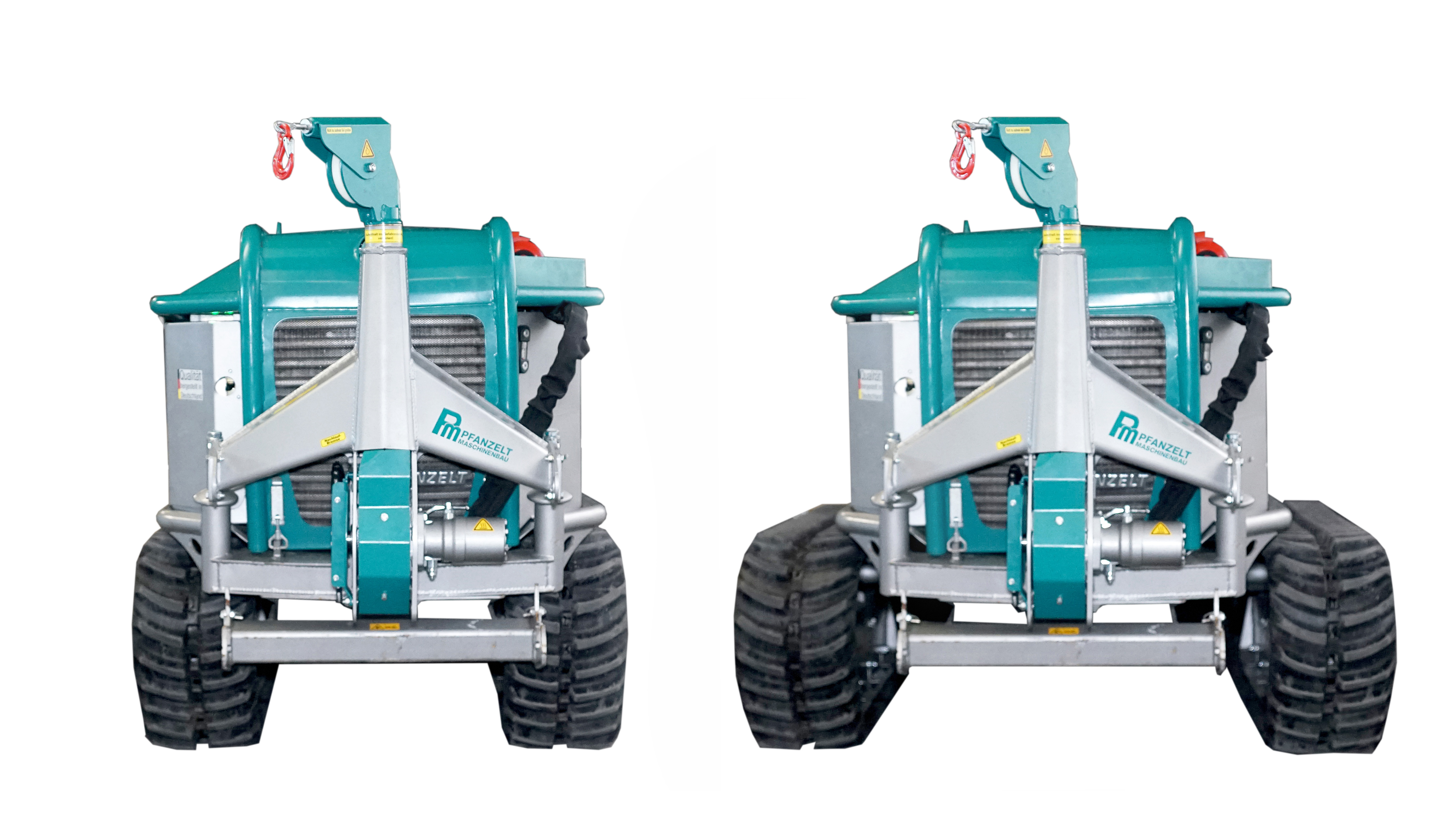 Afin d’atteindre une largeur optimale de châssis adaptée au transport et à une utilisation hors route, la largeur du châssis du Moritz Fr70/75 peut être modifiée. Le châssis peut être élargi de 400 mm par un système hydraulique. Le treuil chenillé peut donc également être utilisé en toute sécurité dans les pentes.