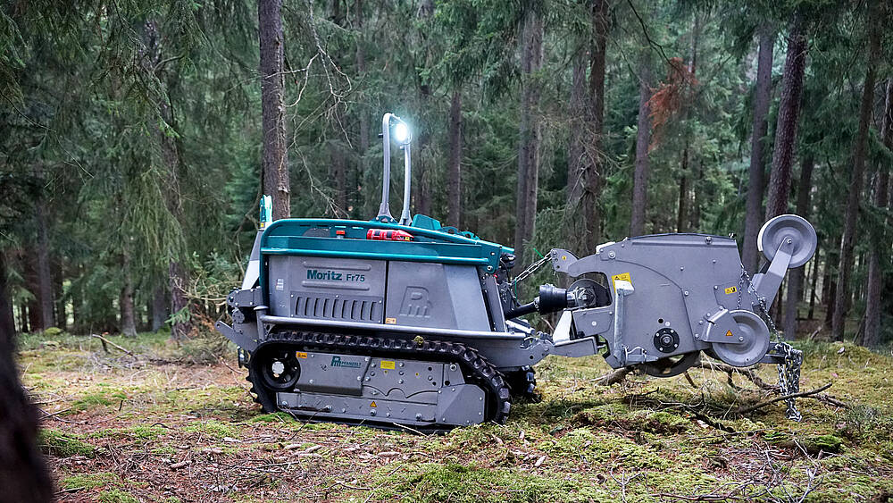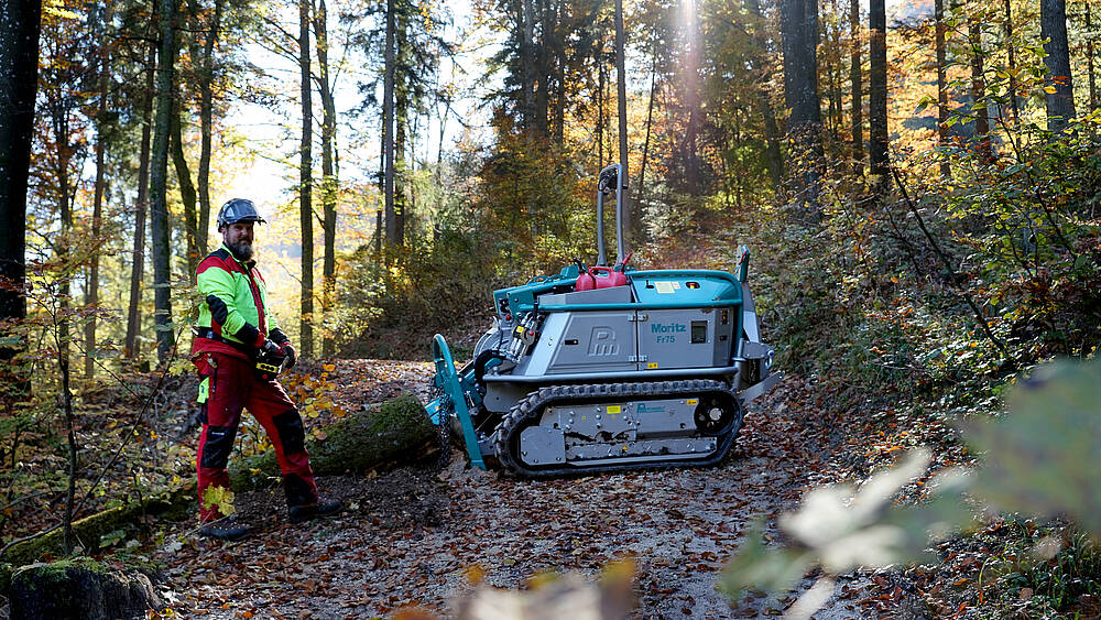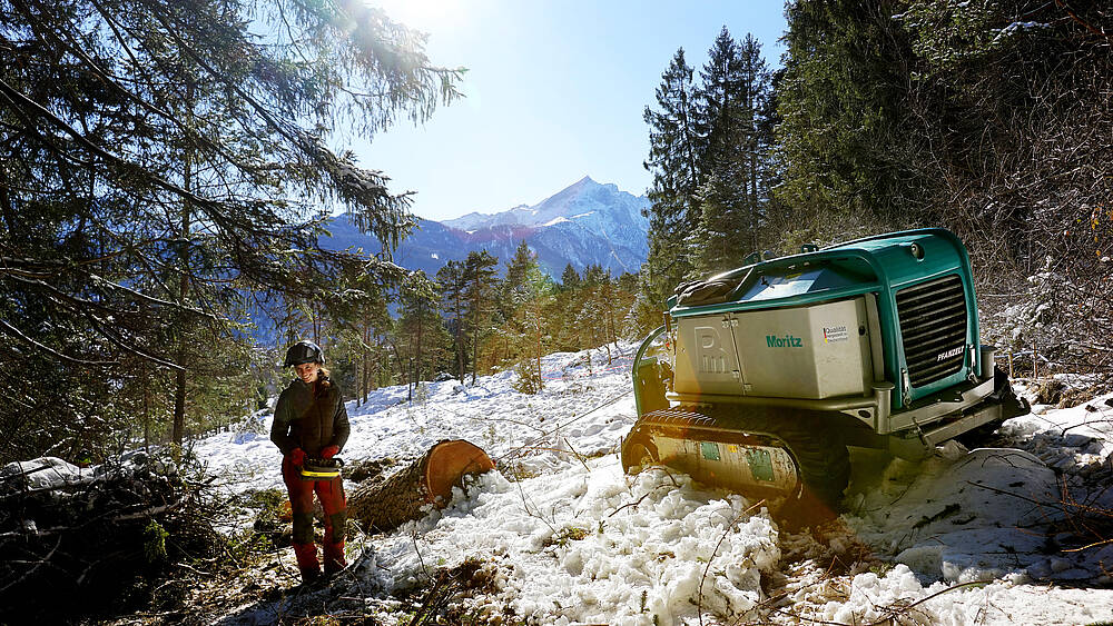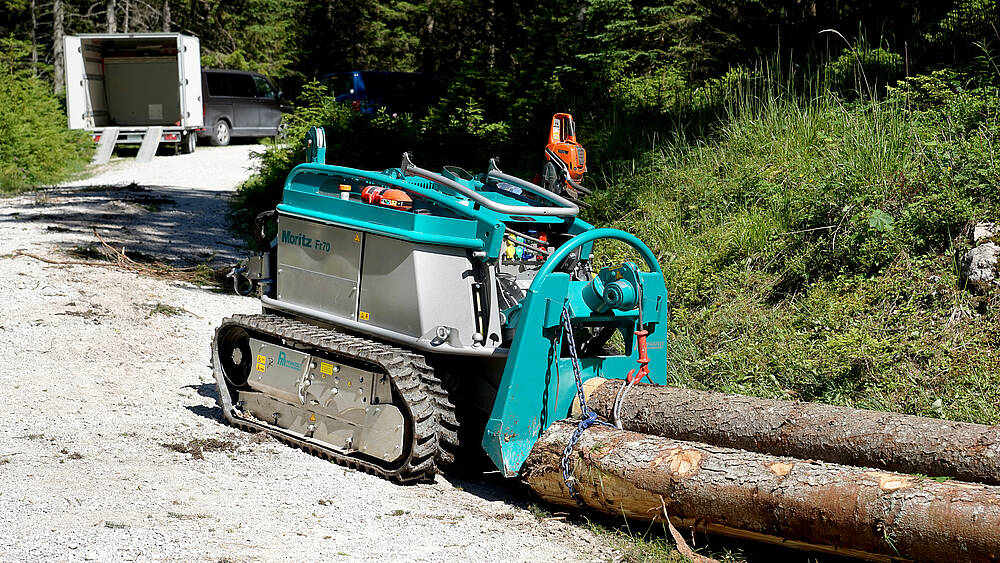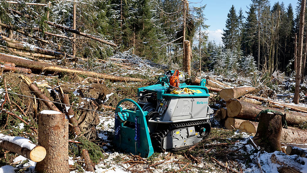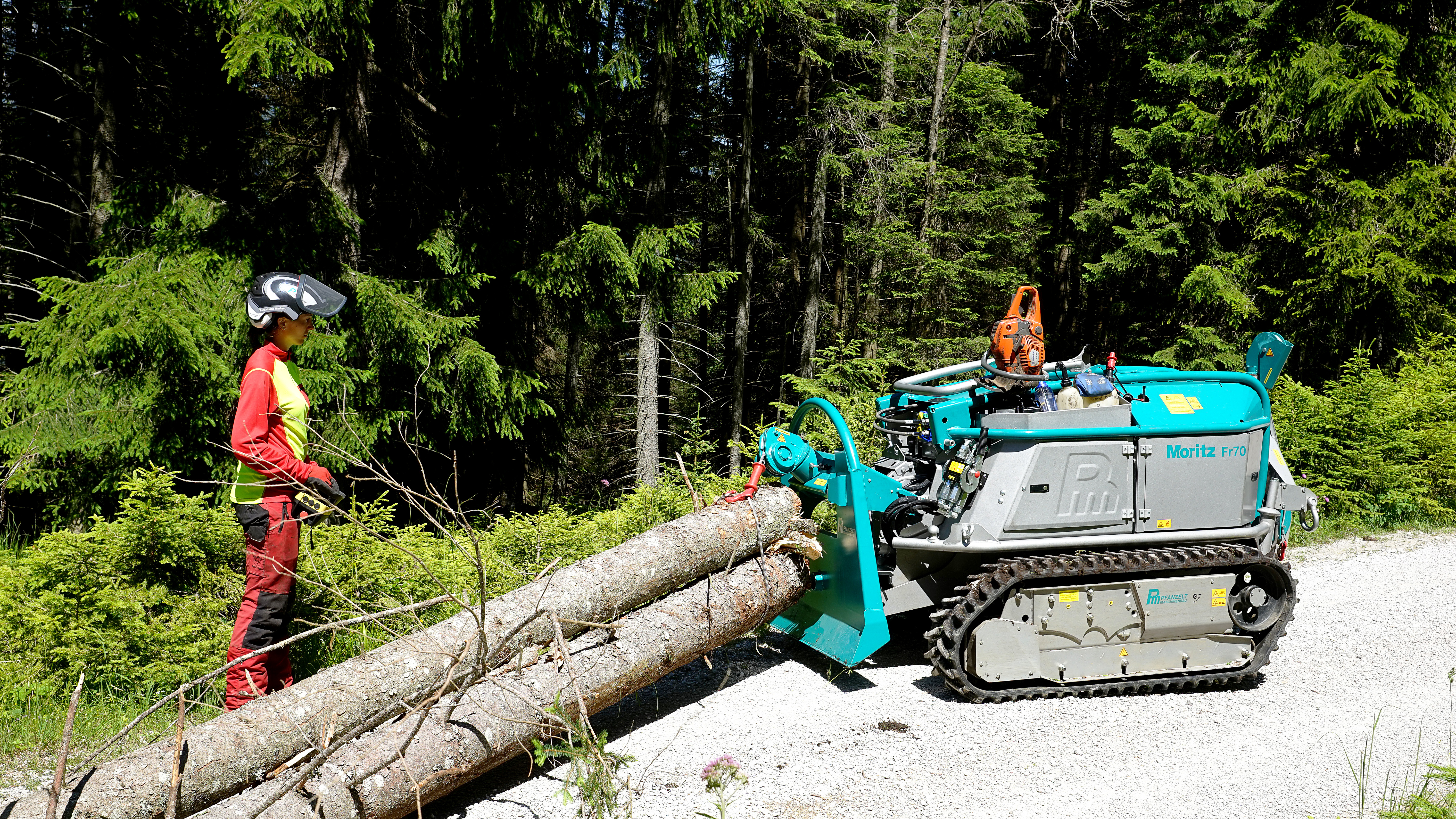 Si les distances dans les ruelles sont trop grandes, une protection accrue du sol est nécessaire en raison des conditions de sol exigeantes ou si les terrains ne peuvent pas être conduits avec de grandes machines forestières pour l’exploitation forestière pour d’autres raisons, alors des chenilles sont utilisées. La nouvelle série de chenille forestière Moritz impressionne par une force de traction du treuil  pouvant atteindre 7,2 t et une faible pression au sol.