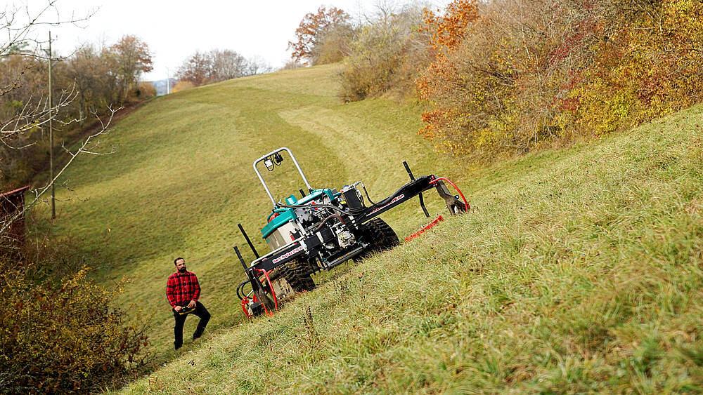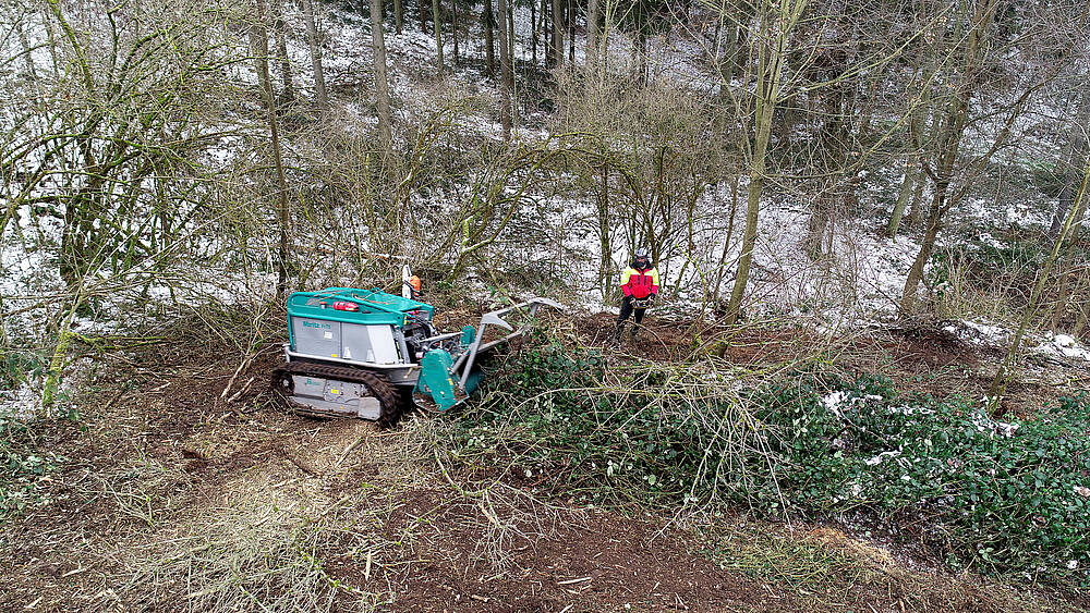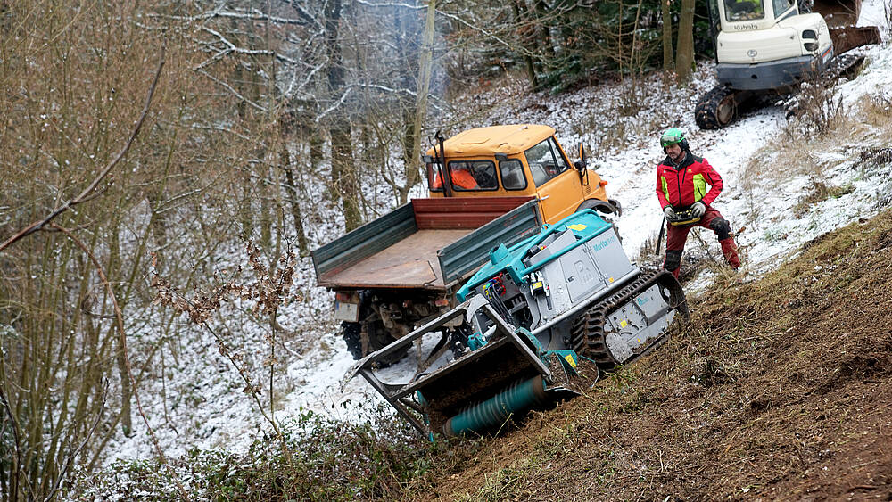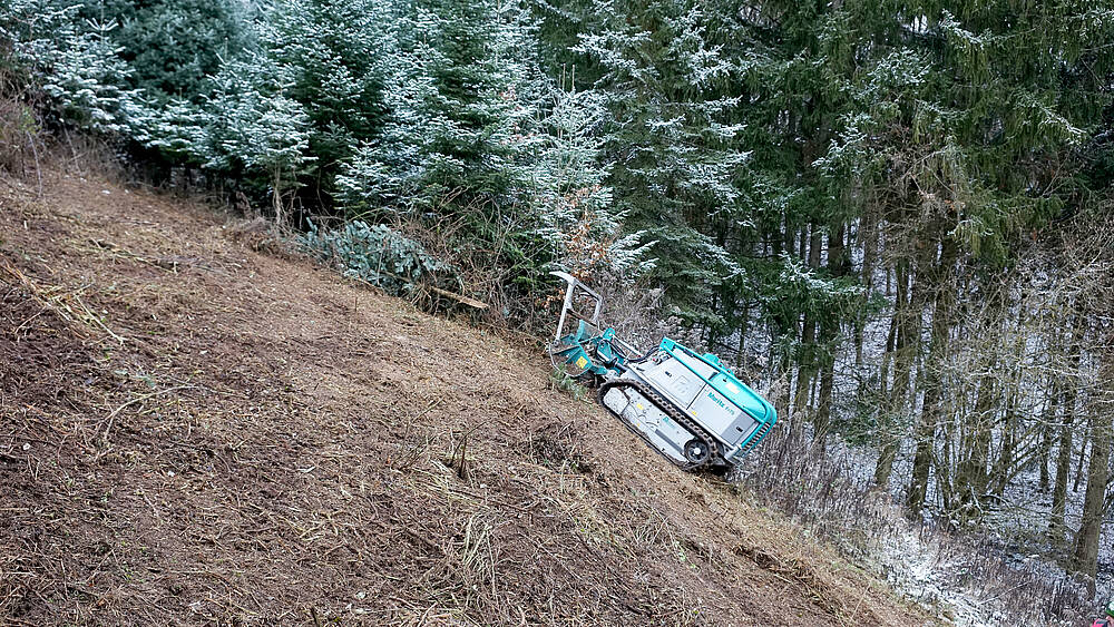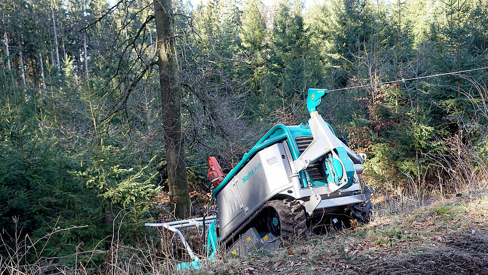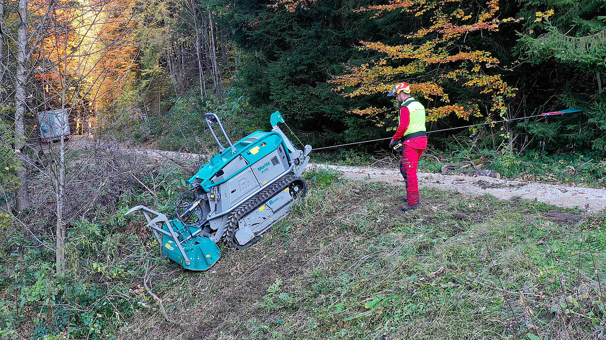 Pour une utilisation sur des pentes raides, la chenille forestière Moritz peut être équipée d’un treuil auxiliaire utilisable à 360 °. Un travail sûr et respectueux du sol est donc également possible en terrain extrême.