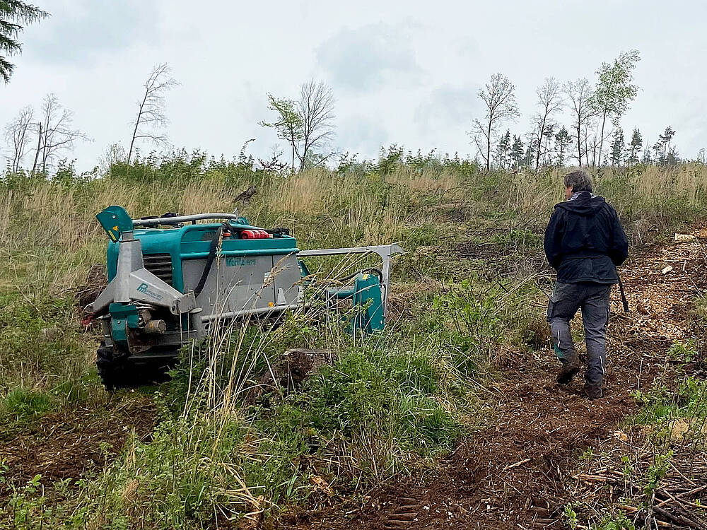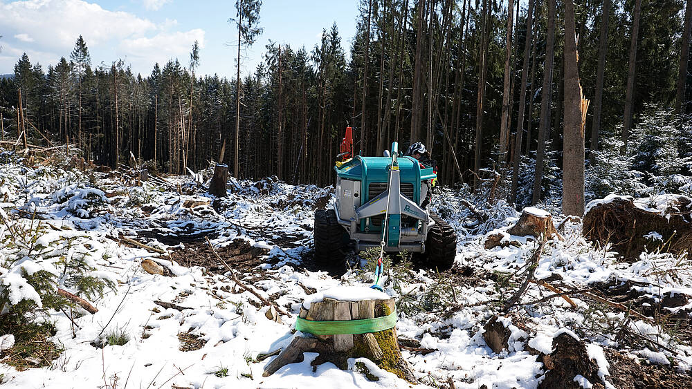 Le Moritz de l’exploitation forestière von Heeren est utilisé en forêt, comme treuil chenillé de débardage et de débusquage en haute saison. Peter von Heeren possède non seulement le treuil forestier pour le treuil chenillé Moritz, mais également un broyeur forestier MAX et il apprécie la rapidité et la simplicité de la transformation.