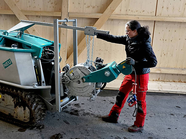 En plus d’un treuil intégré au véhicule avec une orientation favorable, le Moritz peut être utilisé de manière multifonctionnelle comme véhicule porteur tout-terrain. Le treuil, monté sur un système modulaire rapide, peut être démonté en quelques étapes. Le véhicule peut alors recevoir des outils de travail sur l’attelage trois points (cat. 1).