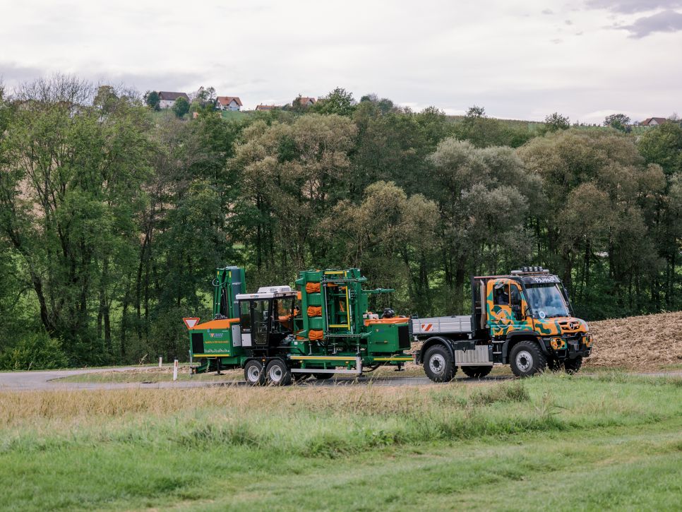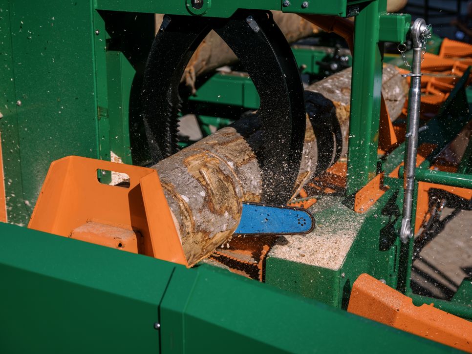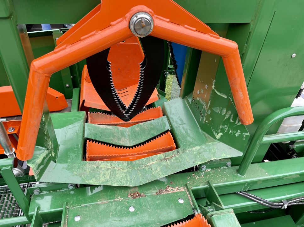 Les deux rouleaux d’alimentation aux dents prononcées transportent jusqu’à la scie des bûches pleines d’un diamètre allant jusqu’à 70 cm – en particulier pour les bûches tordues et les restes de bois.