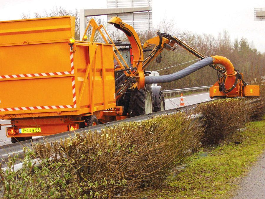 Polyvalent, le taille-haies autoroutier COBRAS sur bras d’épareuse permet, en une seule opération, de couper et broyer les haies, aspirer les déchets avant de les évacuer dans une remorque traînée derrière le tracteur.
