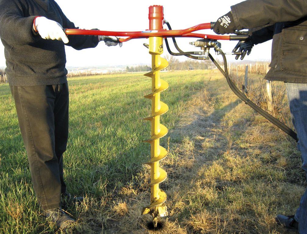 Cette tarière s’utilise par deux opérateurs en face à face, dont l’un à une commande sur ses poignées pour actionner le distributeur hydraulique pour faire tourner la vrille dans un sens ou dans l’autre, afin de réaliser des trous jusqu’à 250 mm de diamètre.