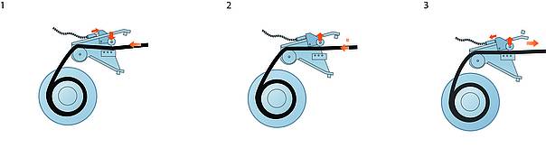 Le frein d’enroulement de câble Pfanzelt permet de garder le câble toujours tendu lors de l’enroulement, même lorsque le bois glisse ou que le câble est enroulé de façon détendue. Lors de l’enroulement, un vérin presse le câble à l’aide d’un galet de freinage sur le sabot de frein. La force du vérin est conçue de façon à ce que le câble ne soit pressé sur le sabot qu’à l’état non chargé. Lors du déroulement, le frein s’ouvre complètement.