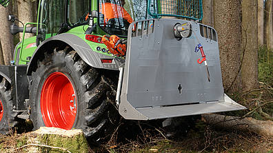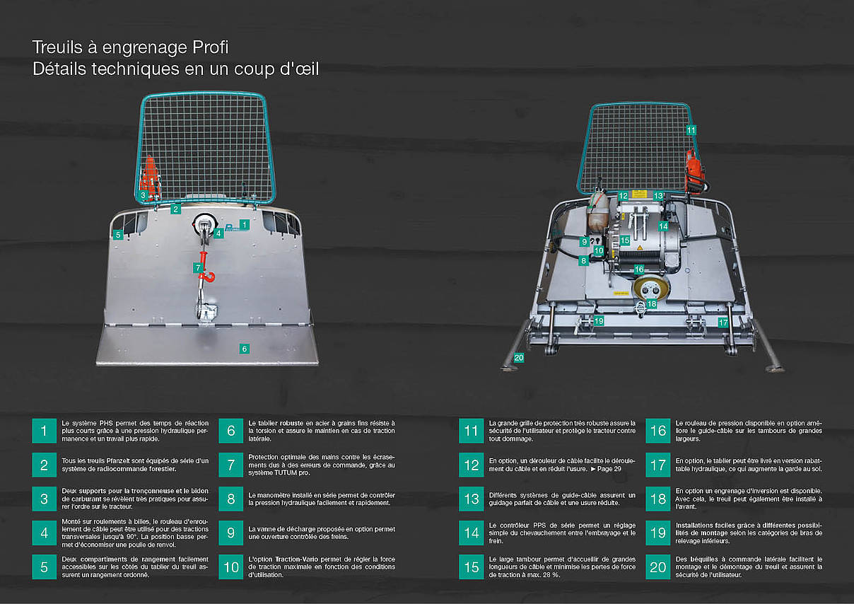 Si le tambour est orienté dans le sens de la traction, cela permet de dérouler très facilement le câble tout en réduisant l’usure, car le câble<br/> n’est pas enroulé ni bobiné sur plusieurs rouleaux dans différents sens. Selon un contrôle de l’institut allemand des travaux forestiers KWF, les<br/> treuils à engrenages Pfanzelt présentent la plus faible consommation d’énergie pour le déroulement. De plus, les treuils sont installés sur le tracteur de façon particulièrement optimisée par rapport au centre de gravité.